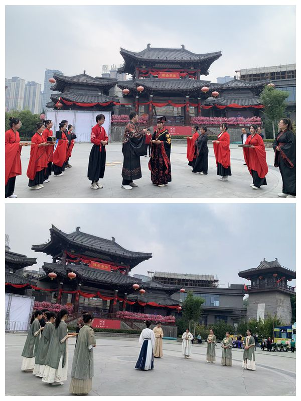 学生们身着古装,在悠扬和肃穆的音乐声中,向前来宝鸡青铜器博物院景区游览观光的广大游客表演了《诗经》吟诵,大型舞台剧《拜师礼》和《士冠礼》,精彩表演吸引观众驻足和鼓掌,有趣的传统文化小游戏更是吸引众多游客参与体验。