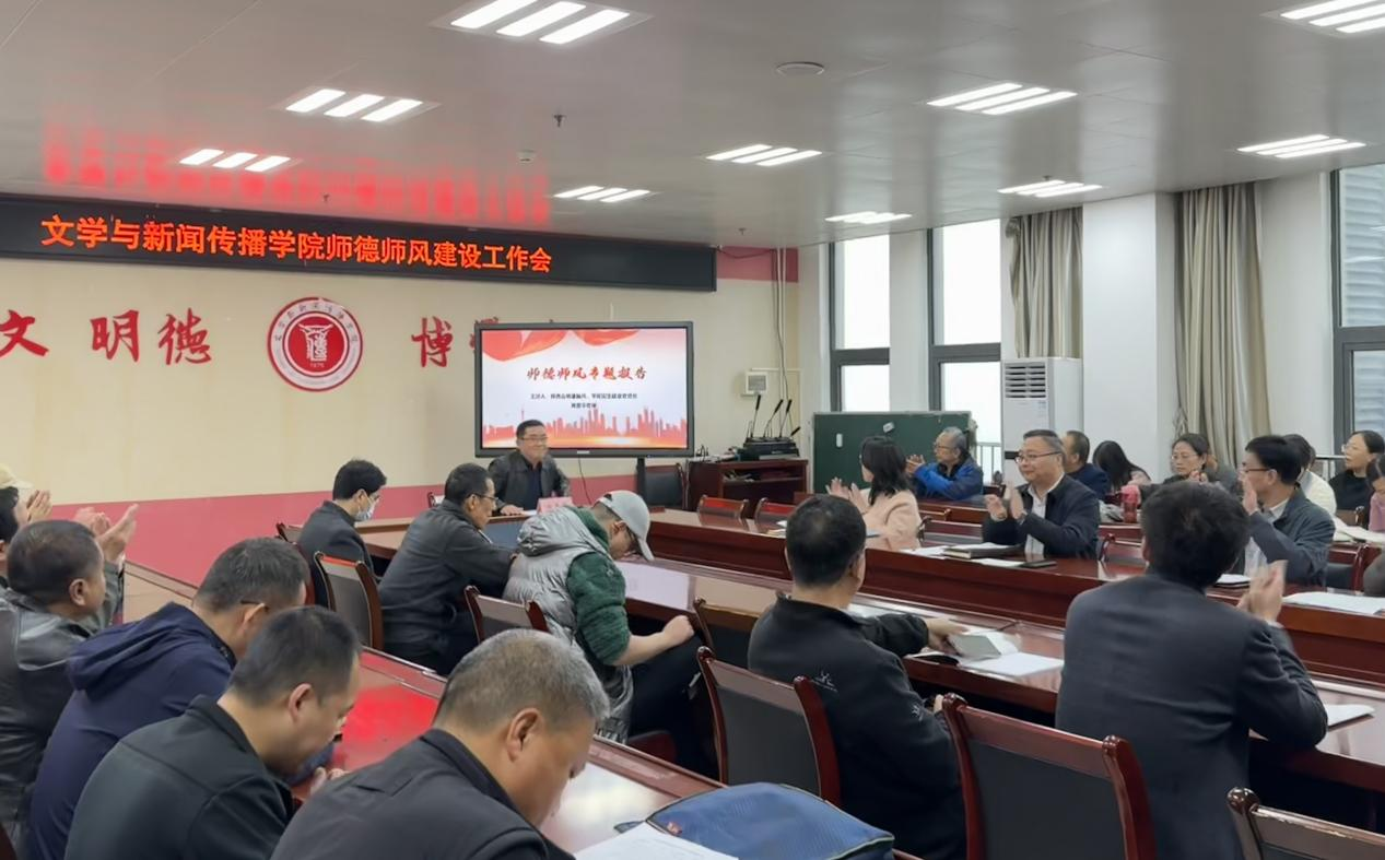 11月13日下午,文学与新闻传播学院在高新校区博文楼1401会议室召开师德师风建设工作会。学院全体教职工参加,会议由学院党委书记郭锋航主持。