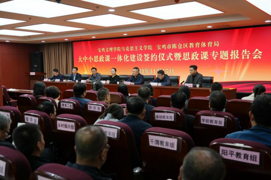 11月15日,马克思主义学院与陈仓区教育体育局在陈仓区教体局二楼会议室举行大中小思政课一体化建设签约仪式暨思政课专题报告会。副校长凡明锦,陈仓区委副书记、区委教育工作领导小组组长柳鹏举出席签约仪式并讲话。马克思主义学院党总支书记张选朝、院长刘晓勇,陈仓区区委常委、宣传部部长徐宏刚,陈仓区教体局党组书记、局长李卫东参加签约仪式。陈仓区政府副区长齐晓辉主持签约仪式。