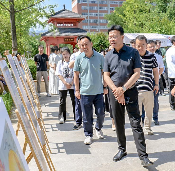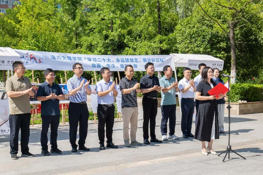 6月5日上午,由校团委主办,美术学院团委承办的“学习党的二十大,永远跟党走,奋进新征程”绘画、书法、摄影大赛获奖作品展开幕式在高新校区博文楼前广场举行。校党委副书记韩干校宣布展览开幕并与合作单位鑫诚通讯器材有限公司总经理王向东一起为获奖学生颁奖。开幕式由美术学院党委书记崔小丽主持。