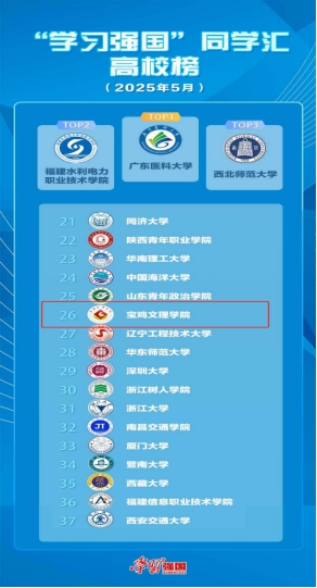 近日,“学习强国”学习平台发布了《同学汇排行榜|高校热度榜2025年第五期(2025.5.1-5.31)》,入驻首月,我校学习强国同学汇入选全国高校热度榜,排名全国第二十六位。