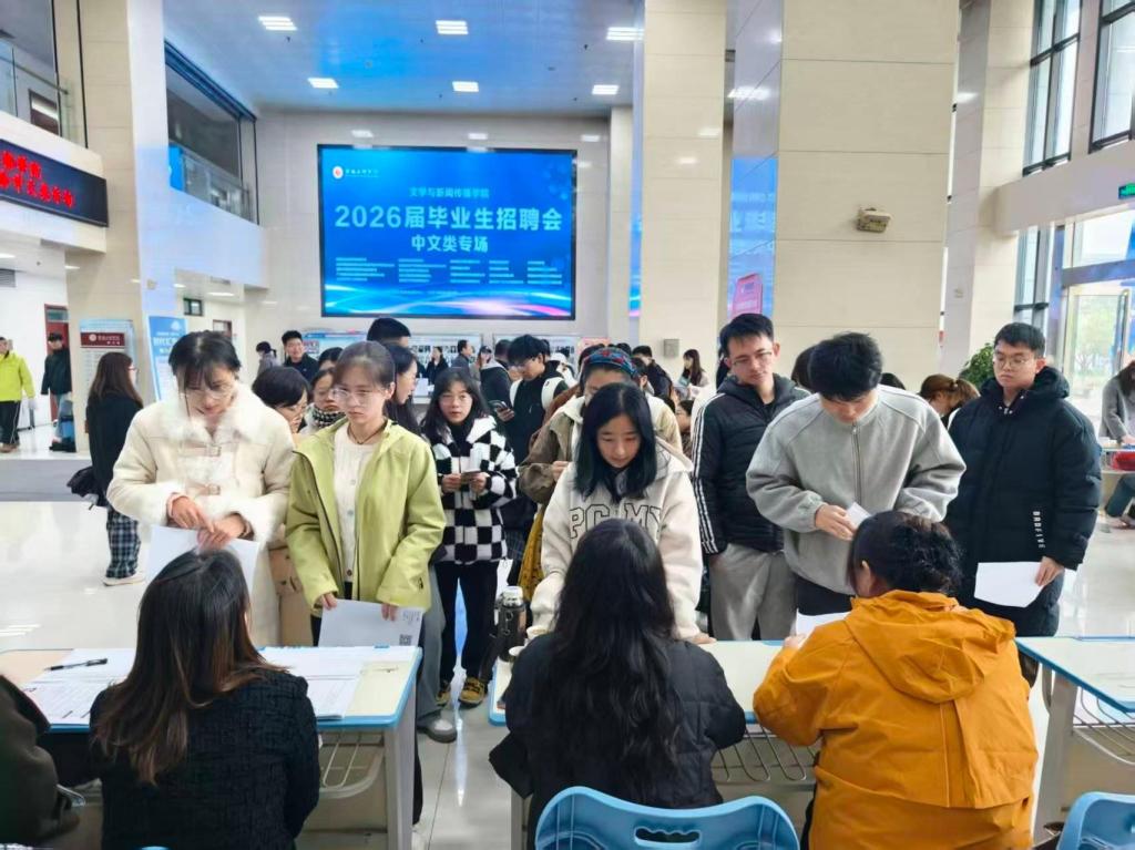 10月24日上午,文学与新闻传播学院在高新校区博文楼一楼大厅举办了2026届中文类毕业生专场招聘会。