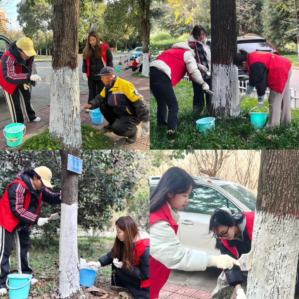 活动中,后勤保障部工作人员围绕树木刷白的技术标准、操作流程及安全注意事项开展专项培训,详细讲解石灰水配比要求、刷白高度、重点涂刷区域,确保参与人员掌握科学操作方法。师生党员与职工分工协作、默契配合,大家严格遵循技术要领,始终保持刷白高度一致、涂层均匀饱满,不放过任何一处易滋生病虫害的“死角”。经过近两小时的辛勤劳动,高新校区思贤楼东侧、保卫处西侧共计79棵树木全部完成刷白作业,整齐划一的白色“防护衣”不仅为冬季校园增添了整洁有序的风景线,更切实保障了苗木健康生长。