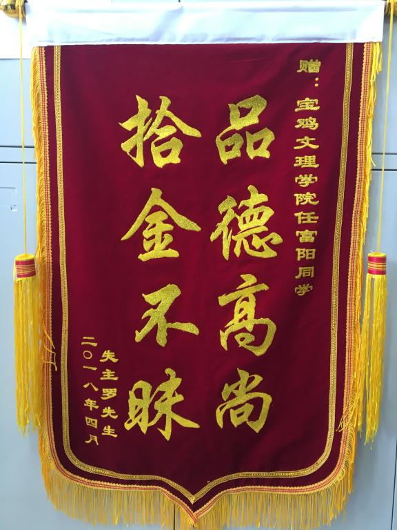 4月26日下午,文学与新闻传播学院2014级汉语言文学专业学生任富阳在校园捡到一部手机,主动归还给失主罗先生并坚持不留姓名不收感谢费。后来罗先生通过我校保卫处知道了学生姓名。5月2日上午,罗先生专程来到文学与新闻传播学院向学生送来锦旗表示感谢,并对学校培养出品德高尚拾金不昧的学生给予了高度评价。(文学与新闻传播学院党总支 文、图/李萍)
