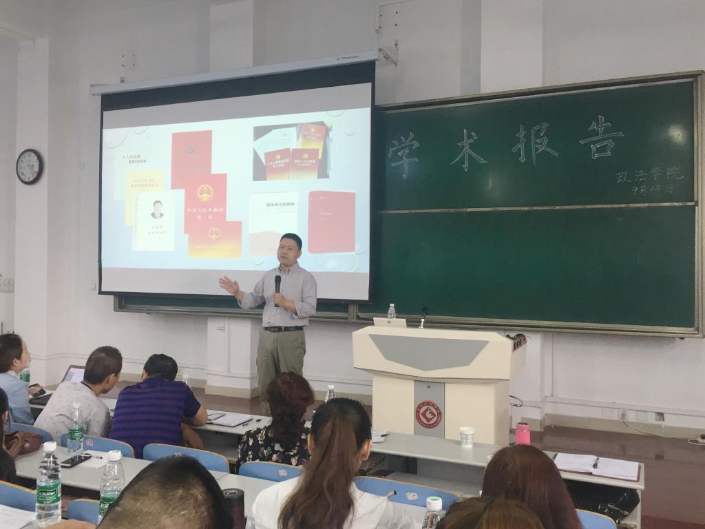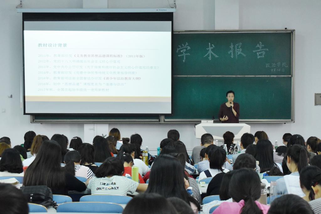 9月14日下午,政法学院邀请国家统编教材《道德与法治》编写组核心成员、中国教育科学研究院杨一鸣教授、首都师范大学钟晓琳教授在思贤楼520阶梯教室为哲学专业与思想政治教育专业全体本科生、学科教学(思政)专业硕士研究生分别作了学术报告。政法学院还特别邀请了宝鸡高新中学等7所实习、见习学校的思想政治课教师聆听了报告。报告会由吴雪会教授主持。
