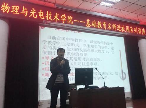11月1日下午,蔡家坡中学物理教师张晓春应邀在我校老校区综合楼2号报告厅作了题为《核心素养背景下课堂教学的实施》的学术报告。物理与光电技术学院200余名师生聆听了报告,报告会由该院副院长张美光主持。