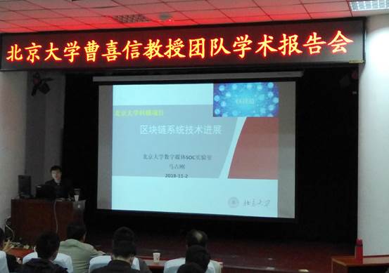 11月2日下午,北京大学曹喜信教授团队应邀在老校区综合楼一楼报告厅作了题为《区块链系统技术进展》的学术报告。计算机学院200多名师生听取了报告。报告会由计算机学院副院长李亚峰副教授主持。