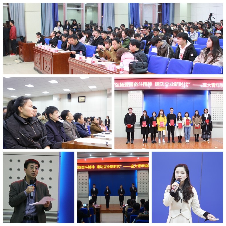 12月19日,由党委宣传部、校团委主办,校青年志愿者协会、融媒体中心承办的“弘扬爱国奋斗精神 建功立业新时代——宝大青年说”演讲比赛决赛在新校区木铎厅举行。