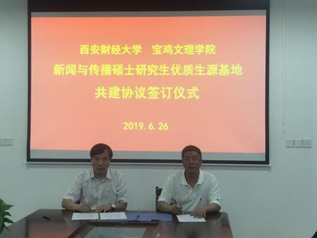 随后举行了西安财经大学、宝鸡文理学院新闻与传播学硕士研究生优质生源基地共建协议签字仪式。我校被西安财经大学授予新闻与传播学研究生优质生源基地,标志着两校合作培养研究生工作正式启动。