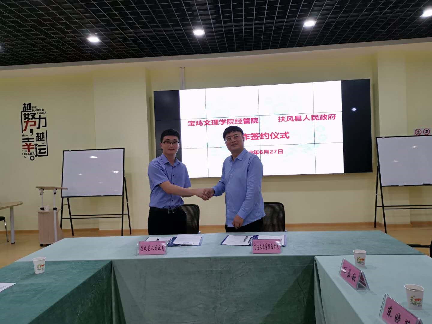 6月27日,经济管理学院与扶风县人民政府在我校尚能楼创新创业实验室举行电子商务校地合作协议签署仪式。宝鸡市商务局副局长李小平、扶风县人民政府副县长赵炳震、扶风县电子商务服务中心王丽娟、经管学院院长张伟峰、副院长刘晓科、工商管理系主任郑蕾以及部分教师代表参加签约仪式。仪式由经济管理学院副院长刘辉主持。