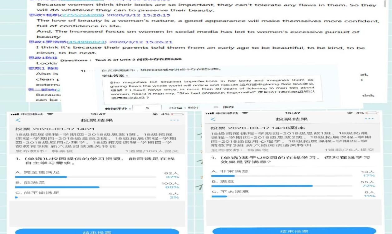 以U校园为依托,教师将学习过程中的指导、监督、评测、反馈有机地融入到学生的自主学习中。U校园是外语教学研究出版社开发的课程同步在线学习平台,上学期已在外国语学院试行。教师可依托U校园的各项功能,有效地开展在线英语教学。依托U校园提供的全部教材的在线资源,彻底解决了学生无教材的问题;平台还提供了丰富的教学资源和互动式的教学模式,老师可以根据教学安排,按照每个时间节点,布置相应的学习内容和评测标准,促使学生以闯关式的学习方式完成各项学习任务,同时教师可以实时监控学生的学习状况,通过QQ群及时反馈学生的学习状况,开展有效的督促和指导;第三通过平台提供完整的学生学习数据,掌握学生的学习状态、学习难点,及时收集和总结教学中存在的问题,不断提升提高教学效果。