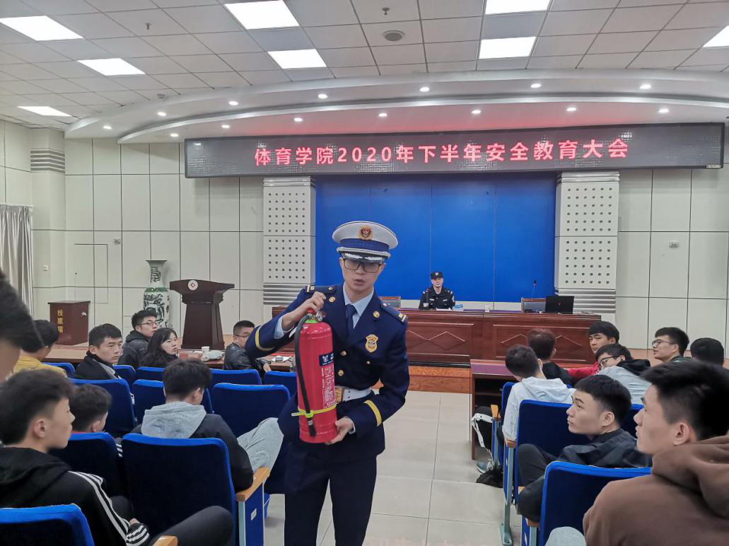 10月9日,体育学院在木铎厅召开安全教育大会。西安市莲湖分局红庙坡派出所民警陈军春和西安市消防救援站消防员陈炳成应邀为240 余名学生作了报告。