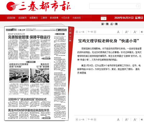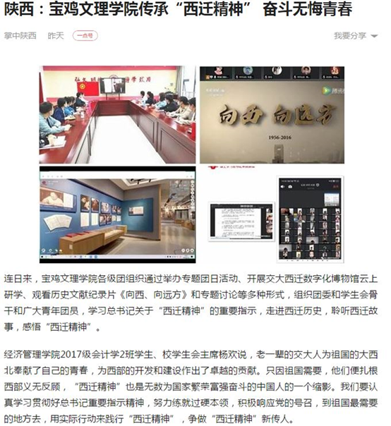 近日,我校大学生热议全国“两会”、传承“西迁精神”和为学生邮寄物品等活动,引起三秦都市报、今日头条、网易、搜狐等多家媒体的广泛关注和报道。