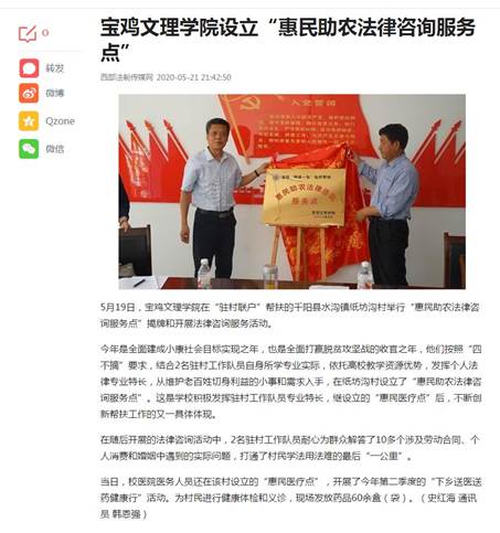 近日,我校举办新冠肺炎疫情防控培训会和在千阳县水沟镇纸坊沟村设立“惠民助农法律咨询服务点”等活动,引起人民日报新媒体、今日头条、网易、搜狐等多家媒体的广泛关注和报道。