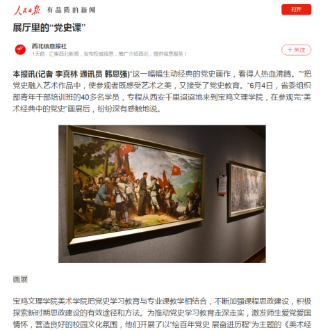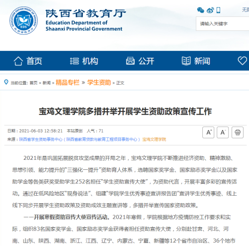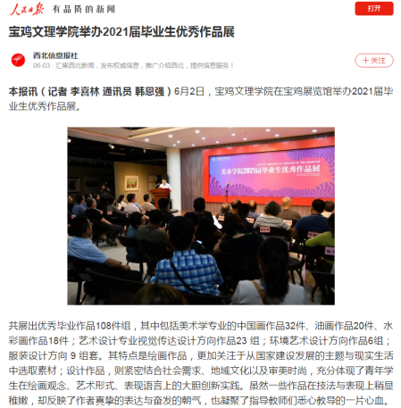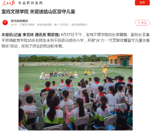 近日,我校为山区留守儿童送温暖、党史学习教育突出“四个用”、 多措并举开展学生资助政策宣传工作、举办2021届毕业生优秀作品展、举行大学生征兵宣讲活动、我校志愿者服务十四运等活动引起人民日报新媒体、陕西省教育厅网站、新华网客户端、学习强国、今日头条、宝鸡电视台等多家媒体的广泛关注和报道。