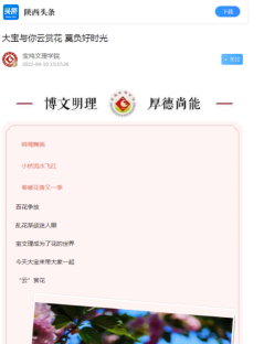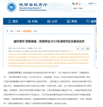 近日,我校开展“2022·奋进·网上祭英烈”主题教育活动、对师生进行新冠疫苗接种、大学生见义勇为等活动引起教育厅网站、中国教育报、学习强国、陕西日报、今日头条等多家媒体的广泛关注和报道。