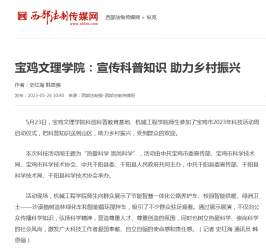 近日,我校举办传统文化艺术周活动、宣传科普助力乡村振兴、推动中华优秀传统文化融入思政课堂等,引起省陕西日报、教育厅网站、中国教育报、今日头条、阳光网等多家媒体的广泛关注和报道。