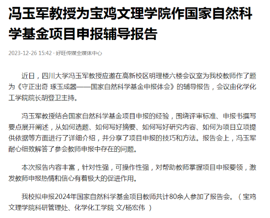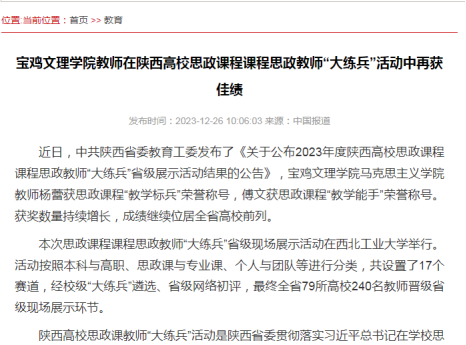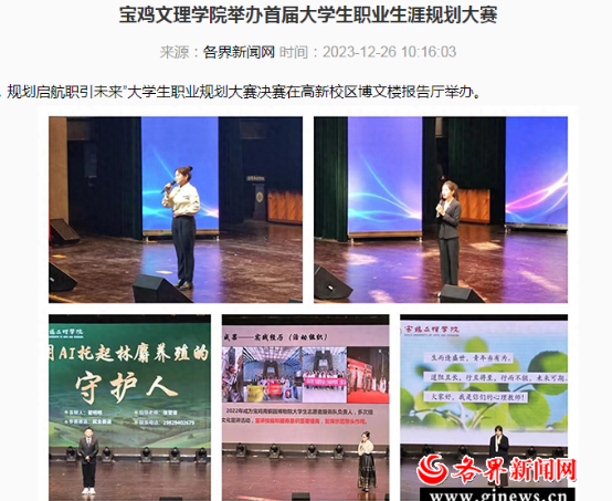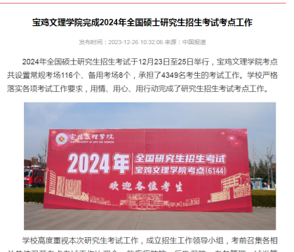 近日,我校完成2024年全国硕士研究生招生考试考点工作、在陕西高校思政课程课程思政教师“大练兵”活动中再获佳绩、举办首届大学生职业生涯规划大赛、“重温经典诗词,焕活宝鸡文理青年力量”等活动引起中国报道网、陕西广电传媒、二三里、阳光网、各界新闻网、起点新闻、好旺传媒,三秦都市报等多家媒体广泛关注和报道。