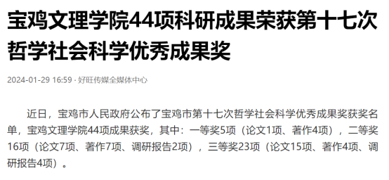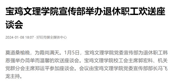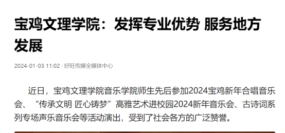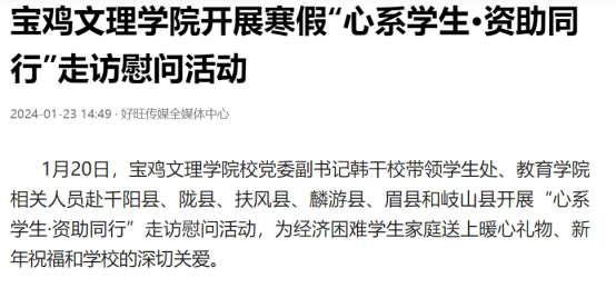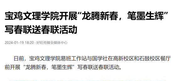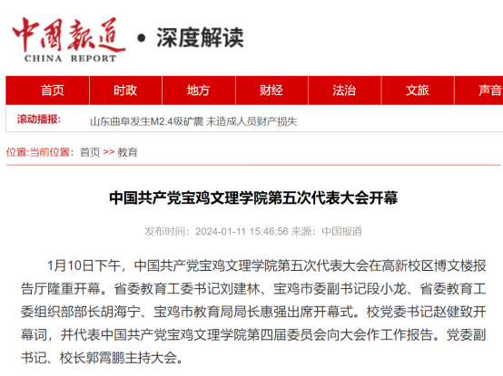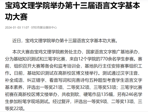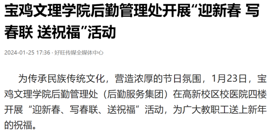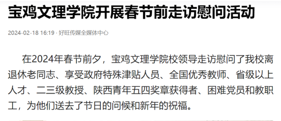 近日,我校举办第十三届语言文字基本功大赛、发挥专业优势 服务地方发展、宣传部举办退休职工欢送座谈会、2022届毕业生李昊宸荣获“最美三秦西部计划志愿者”之星称号、召开2024届毕业生就业工作推进会、第五次党代会隆重开幕、收到西北师范大学心理学院的感谢信、写春联送春联活动、开展寒假“心系学生·资助同行”走访慰问、获批41项2024年度陕西省科技计划项目、44项科研成果荣获第十七次哲学社会科学优秀成果奖、颜艺艺同学获“陕西省优秀共青团员”称号、开展春节前走访慰问等活动引起中国报道网、阳光网、西部法制传媒网、好旺传媒,阳光报、西部法制报等多家媒体广泛关注和报道。