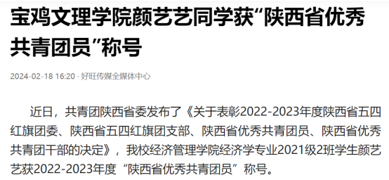 十四、颜艺艺同学获“陕西省优秀共青团员”称号