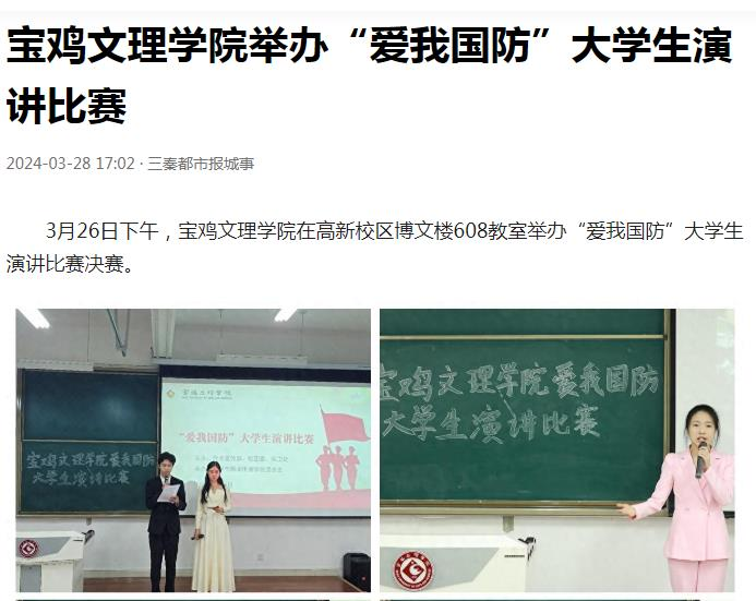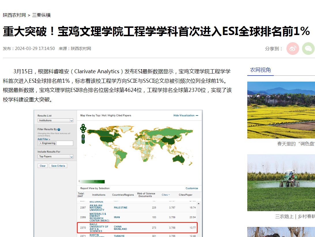 近日,我校工程学学科首次进入ESI全球排名前1%,新增两个本科专业,“爱我国防”大学生演讲比赛等活动引起陕西日报、阳光网、陕西农村网、陕西科技传媒网、好旺传媒等多家媒体广泛关注和报道。