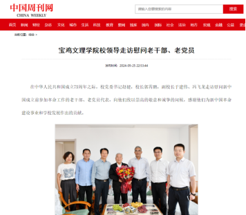 近日,校领导走访慰问老干部、老党员,顺利完成2024级新生入学报到工作,举行2024级新生开学典礼暨军训动员大会,开展2024级新生军事训练,推出纪念邓小平诞辰120周年红色音乐党课,开展英烈事迹宣讲,举办2024年机关年轻干部素质能力提升训练营开营仪式,在长乐塬抗战工业遗址开展主题团课,第十届“教学名师”风采,举办2024陕西青年科学家大会,向师生发放定制月饼等活动引起中国周刊网、学习强国、今日头条、宝鸡融媒体中心等多家媒体广泛关注和报道。