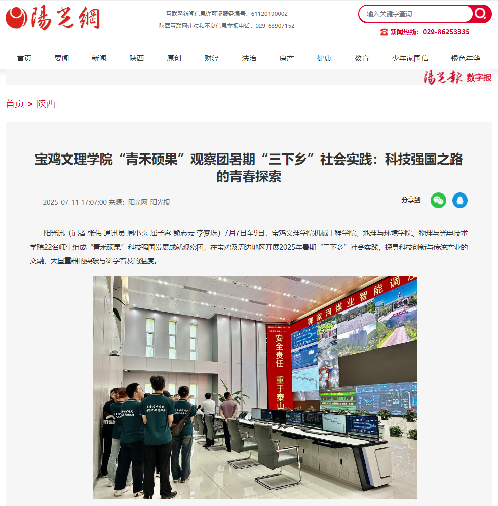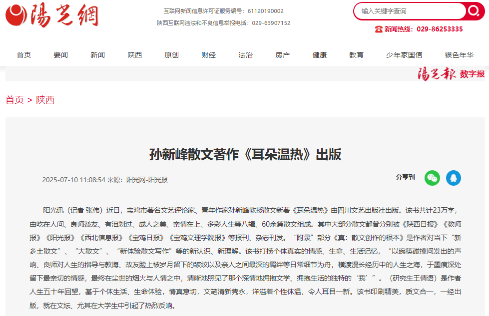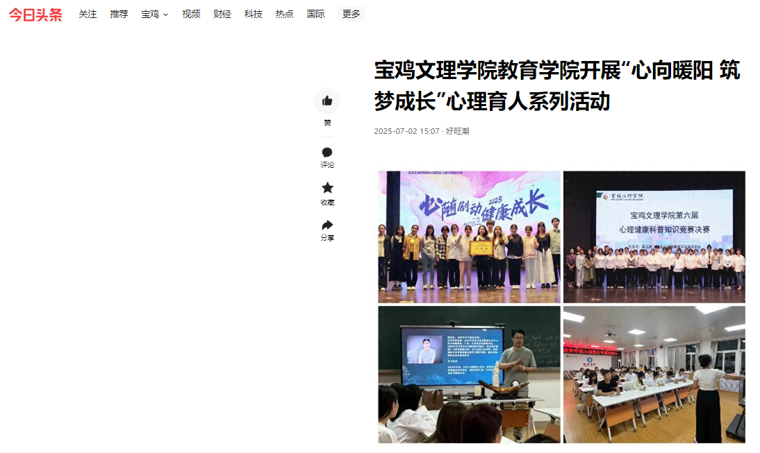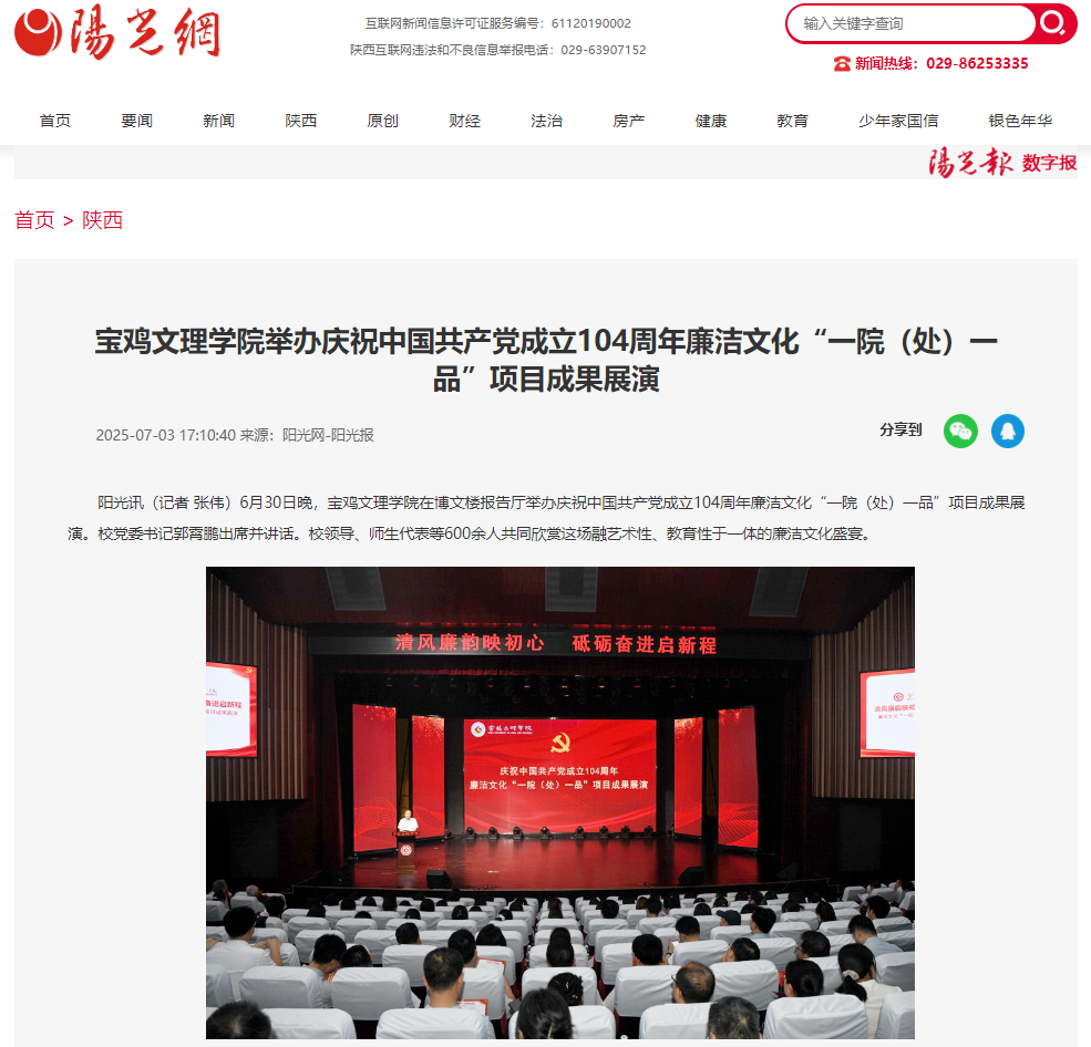 近日,学校举办庆祝中国共产党成立104周年廉洁文化“一院(处)一品”项目成果展演、《陕西日报》刊发我校师生学术文章、开展暑期“三下乡”社会实践活动、教育学院开展“心向暖阳 筑梦成长”心理育人系列活动、孙新峰教授散文著作《耳朵温热》出版等活动引起学习强国、陕西日报、阳光网、陕西都市新闻、陕西晨报、宝鸡市融媒体中心、今日头条等多家媒体广泛关注和报道。