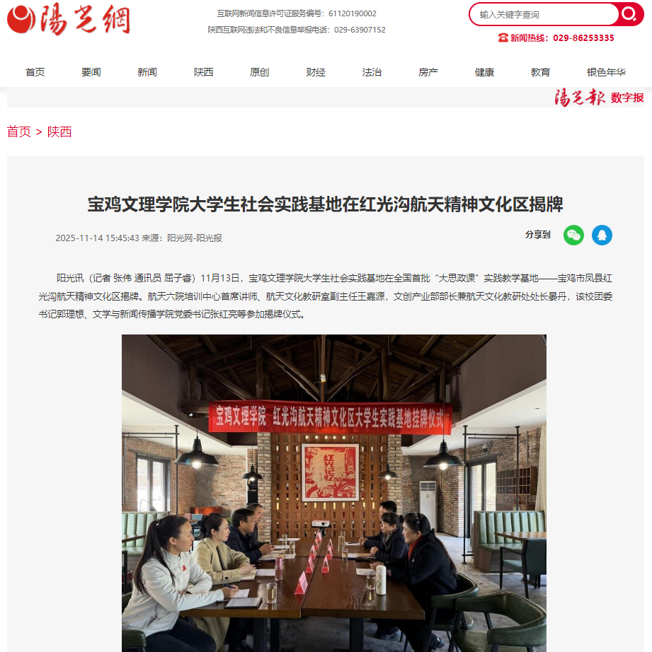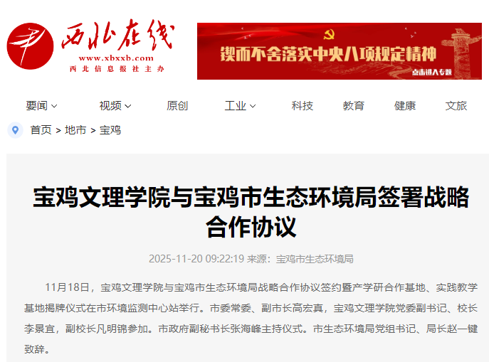 近日,学校开展“到延安去”·三秦学子圣地行教育活动、大学生社会实践基地在红光沟航天精神文化区揭牌、校友王佳佳为山区学生教授街舞受到广泛关注与赞誉、学校举办百企万岗进校园大型就业洽谈会、3个基层党组织入选第五批新时代陕西高校党建“双创”工作培育创建单位、与陈仓区人民检察院启动“检校合作与服务项目”、与宝鸡市生态环境局签署战略合作协议、纪念抗战胜利80周年舞台美术作品展在我校开幕、学校举行“AI视域下陕西当代文学研究高层论坛暨年度工作会议”等活动引起中央电视台、学习强国、西部法治报、西北在线、阳光网、陕西农村网、中华网、西铁宝鸡东站、今日头条等多家媒体广泛关注和报道。