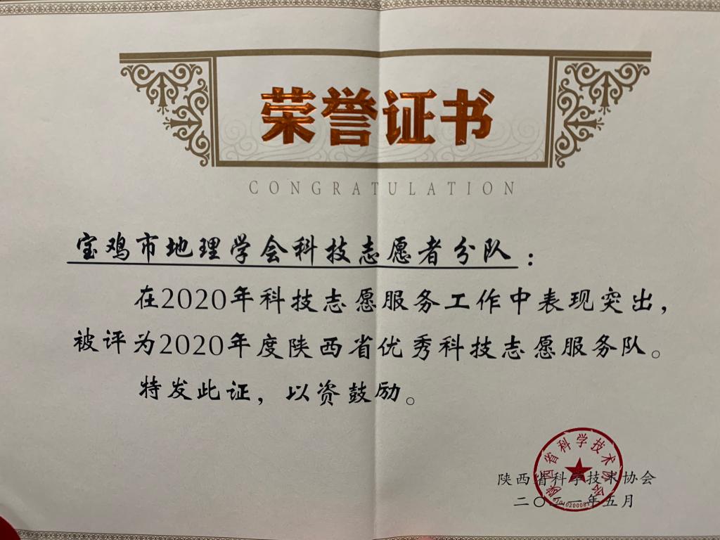 近日,根据省科协《关于开展2021年度优秀科技志愿服务工作典型推选活动的通知》(陕科协发〔2021〕普字14号)要求,经宝鸡市科协推荐和省科协组织专家评审,我校“地理爱好者协会”作为地理与环境学院、陕西省灾害监测与机理模拟重点实验室和宝鸡市地理学会协同管理指导的科技志愿服务组织,荣获陕西省“2020年度优秀科技志愿服务队”称号。