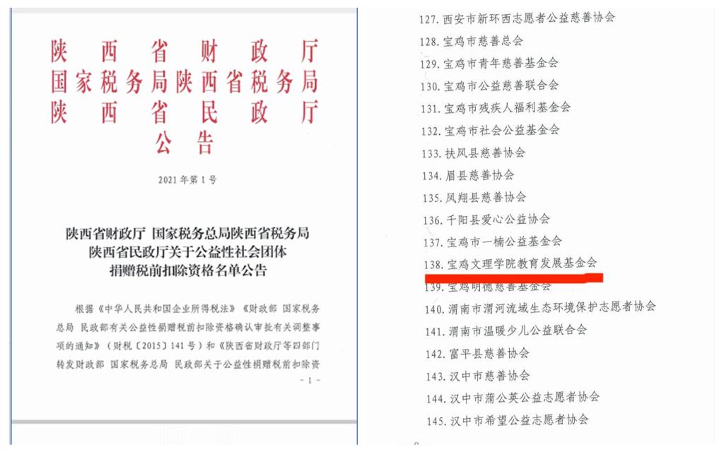 根据《陕西省财政厅、国家税务总局陕西省税务局、陕西省民政厅关于公益性社会团体捐赠税前扣除资格名单公告》,宝鸡文理学院教育发展基金会获得公益性社会团体捐赠税前扣除资格。获此资格,意味着向我校教育发展基金会捐赠的企业和个人可依法享受国家税前扣除的税收优惠政策。