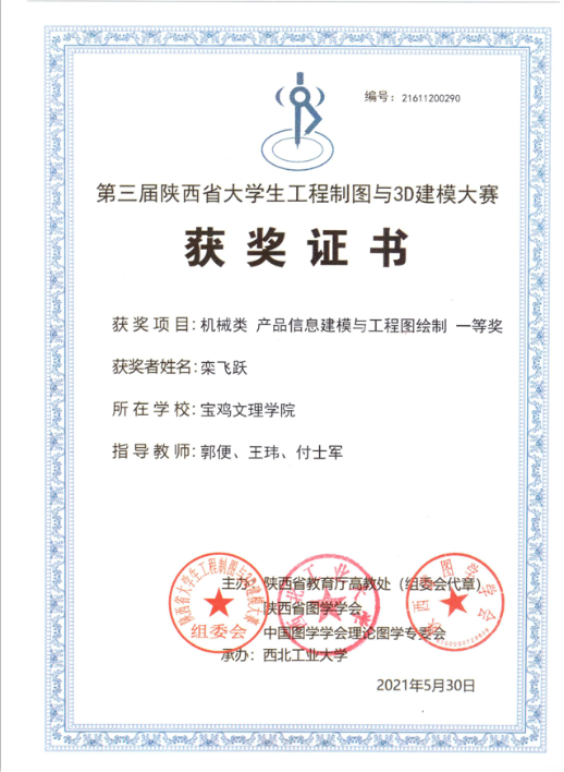近期,第三届陕西省大学生工程制图及3D建模大赛在西北工业大学举办。我校机械工程学院栾飞跃、王振华等15名学生参赛,最终获得机械类团体赛二等奖1项,个人赛一等奖1项、二等奖5项、三等奖8项。郭便、付士军、王玮被评为优秀指导教师。