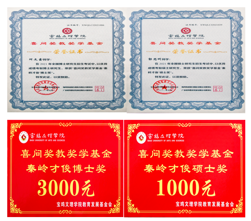 6月25日上午,在我校2021届学生毕业典礼暨学位授予仪式上,学校党政领导为荣获“喜问奖教奖学基金‘秦岭才俊’博士奖、 硕士奖”代表颁发荣誉证书、奖金。经各二级学院上报,研究生院、学生处审定,校教育发展基金会、捐赠人审核,王妍等6名考取博士的2021届硕士毕业生荣获“喜问奖教奖学基金‘秦岭才俊’博士奖”,每人发放奖金3000元;师文豪等350名考取硕士的2021届本科毕业生荣获“喜问奖教奖学基金‘秦岭才俊’硕士奖”,每人发放奖金1000元。
