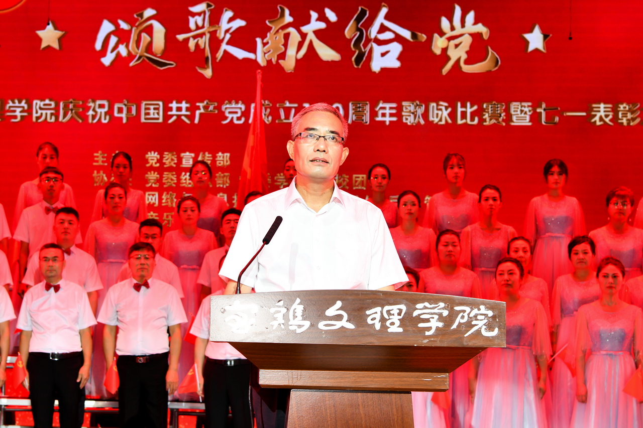 校党委书记赵健发表了热情洋溢的讲话。他代表学校党委向受表彰的先进集体和个人表示热烈的祝贺,向荣获纪念章的老党员致以崇高的敬意,向辛勤工作、无私奉献的全校共产党员和广大师生员工表示衷心的感谢和节日的问候。他指出,中国共产党的一百年是矢志践行初心使命、举旗定向奠基立业、砥砺前行开辟未来的一百年,是苦难中铸就辉煌、挫折后毅然奋起、探索中收获成功、失误后拨乱反正、转折中开创新局、奋斗后赢得荣光的一百年。63年来,宝鸡文理学院同伟大的党一起走过了光荣而曲折、坚实而豪迈的征程。在党的领导下,一代代文理人始终坚持党的教育方针,克服重重困难,历经坎坷艰辛,三迁校址、三易校名,终于把学校建设成为矗立于三秦大地的一座巍巍学府,谱写了学校事业发展的壮丽凯歌。他强调,学校正处在内涵发展的关键期、深化改革的攻坚期、创大更名的冲刺期,全校各级党组织和广大党员要始终坚守立德树人初心,担当为党育人、为国育才使命,立足新发展阶段、贯彻新发展理念、构建新发展格局,不断提振干事创业的“精气神”,锻造担当作为的“铁肩膀”,争做勇立潮头的“弄潮儿”,在新时代追赶超越和高质量发展征程上作出新的更大贡献。