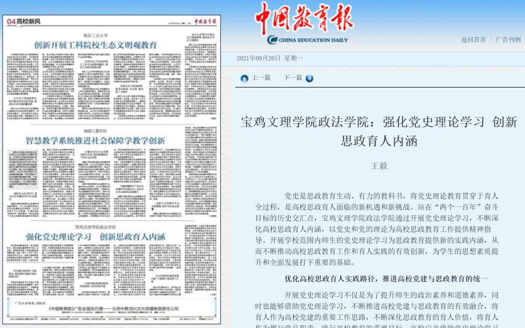 2021年9月20日,《中国教育报》在第四版以“宝鸡文理学院政法学院:强化党史理论学习 创新思政育人内涵”为题,刊发了我校政法学院教师王毅采写的文字报道。该报道从“优化高校思政育人实践路径,推进高校党建与思政教育的统一”“以党史理论教育创新高校思政育人的形式和内涵”“充分发挥党史理论教育功能,不断提升思政育人价值”等三个方面对我校思政育人工作进行了介绍。(党委宣传部 文/崔小丽 审核/冯飞龙)
