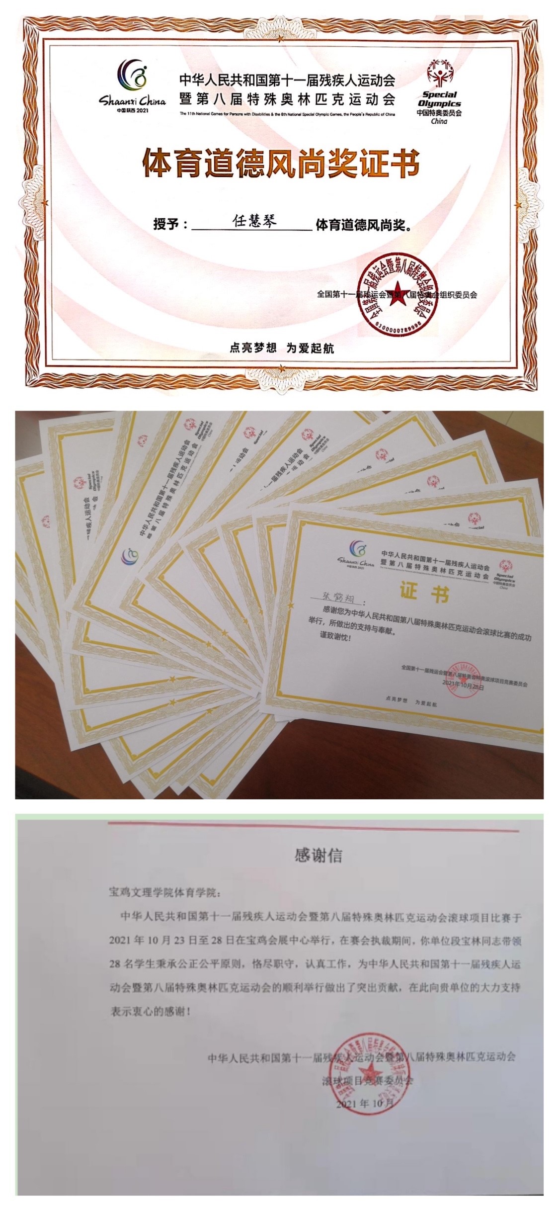 近日,中华人民共和国第十一届残疾人运动会暨第八届特殊奥林匹克运动会滚球项目竞赛组委会为我校体育学院发来感谢信,对我校体育学院助力运动会裁判工作表示感谢,对学院段宝林教授以及参加裁判工作的28名同学表示感谢。