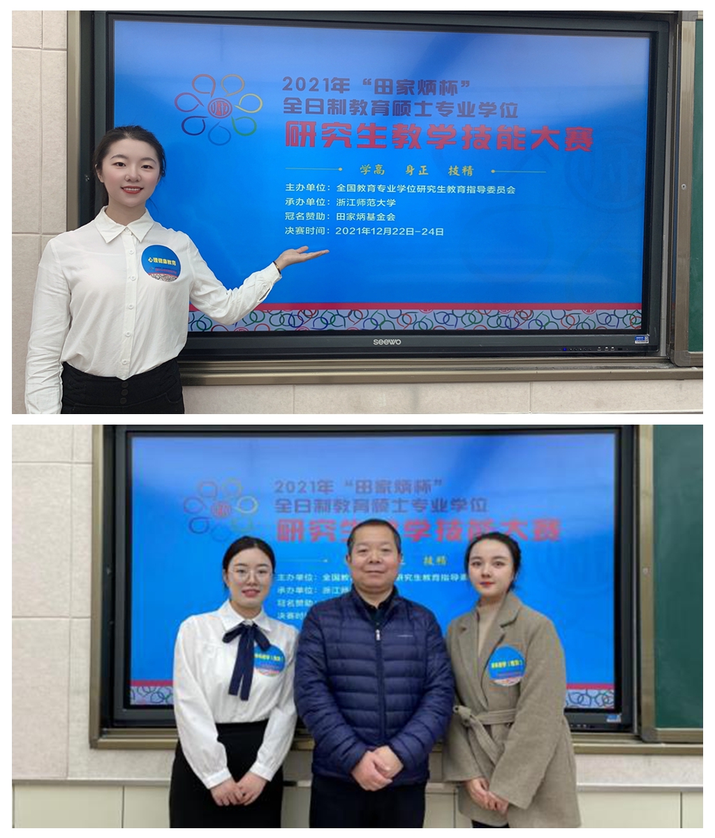 近日,由全国教育专业学位研究生教学指导委员会主办的2021年“田家炳杯”全日制教育硕士专业学位研究生教学技能大赛成功举办。在我校教育学院院长马多秀、副院长胡少明、教授罗增让和政法学院院长张波、副院长杨福荣的带领下,教育学院2020级心理健康教育专业王颖同学和政法学院2020级学科教学(思政)专业王姝懿、张蕊等3名同学从初赛中脱颖而出入围了决赛,并在此次决赛中荣获“田家炳杯”全日制教育硕士专业学位研究生教学技能大赛三等奖。