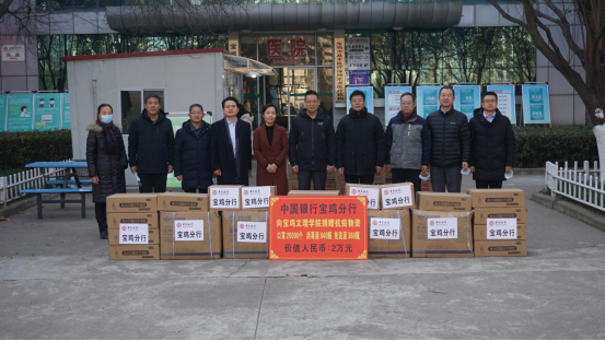 1月13日上午,中国银行宝鸡分行行长郭缙,副行长李刚一行向我校捐赠防疫物资。副校长李景宜、韩干校参加捐赠活动。