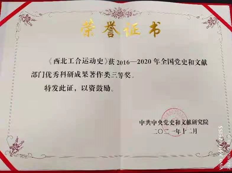 近日,全国党史和文献部门主要负责人会议以视频形式召开,会议表彰了2016-2020年全国党史和文献部门先进集体、先进个人和优秀科研成果。中共陕西省委党史研究室选送的11项成果获得优秀科研成果各类奖项,其中我校西北工合研究中心首席专家张占勤主撰的《西北工合运动史》获著作类三等奖。