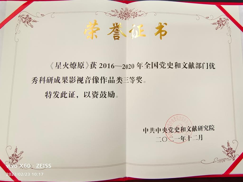 近日,全国党史和文献部门主要负责人会议以视频形式召开,会议表彰了2016—2020年全国党史和文献部门先进集体、先进个人和优秀科研成果。由中共宝鸡市委党史研究室联合宝鸡市教育局共同制作,由我校马克思主义学院院长刘晓勇和麟游县委常委、县纪委书记、县监委主任上官青云担任编剧的五集地方党史影片《星火燎原》荣获“2016—2020年全国党史和文献部门优秀科研成果影视音像作品类三等奖”。这是近年来宝鸡党史研究成果获得的最高奖项。