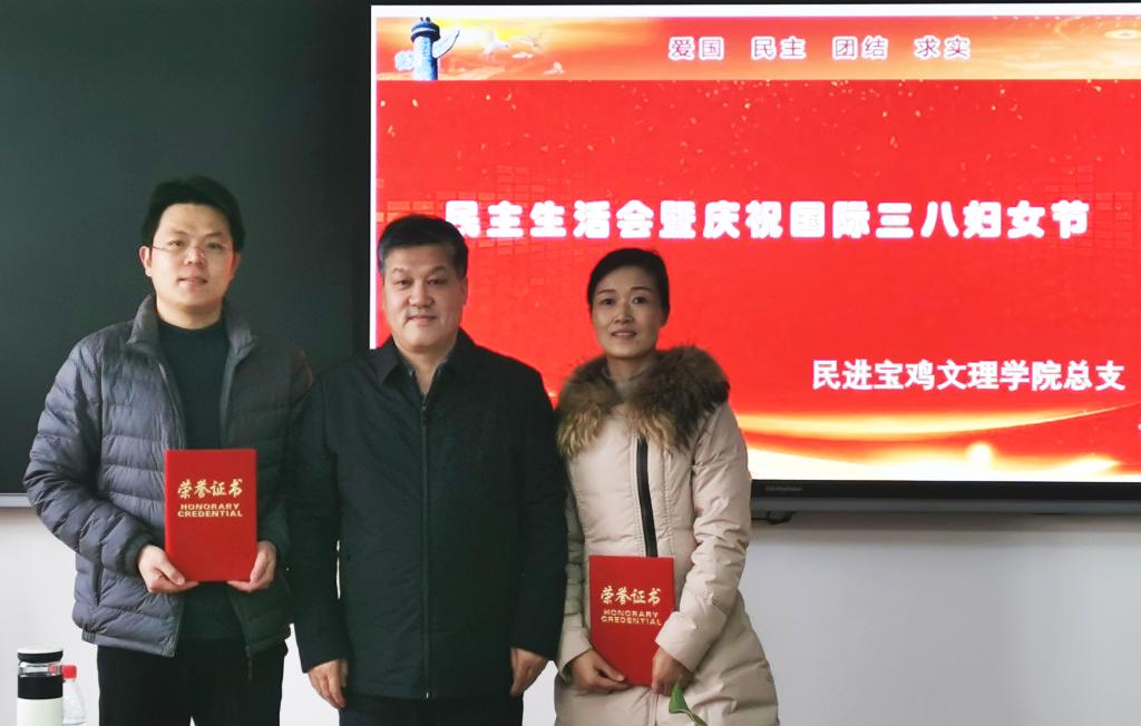 3月3日,民进宝鸡文理学院总支召开2022年民主生活会暨庆祝“三八”国际劳动妇女节活动,副校长王富平应邀出席并为获得2021年度民进宝鸡市委会优秀会员和优秀会务工作者颁发荣誉证书,会议由总支副主委王刚主持。