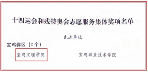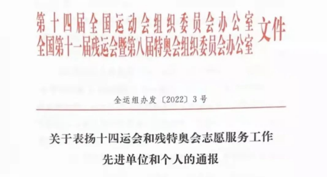 近日,第十四届全国运动会组委会办公室、全国第十一届残奥会暨第八届特奥会组委会办公室联合印发了《关于表扬十四运会和残奥运会志愿服务工作先进单位和个人的通报》,我校荣获“十四运会和残特奥会志愿服务先进单位”称号,宁伟龙等23名赛会志愿者荣获“十四运会和残特奥会优秀志愿者”称号。