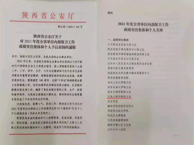 近日,在2021年度全省单位内部保卫工作成绩突出集体评比表彰活动中,我校保卫处荣获“2021年度全省单位内部保卫工作成绩突出集体”荣誉称号,这也是继我校保卫处荣获“2021年度全市单位内部安全保卫工作先进集体”荣誉称号后获得的又一殊荣。