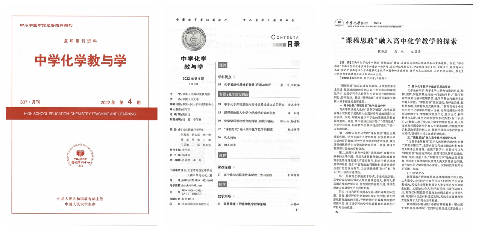 近日,我校化学化工学院马琳副教授教学研究团队完成的研究论文《“课程思政”融入高中化学教学的探索》被人大复印资料全文转载,转载时间为2022年4月,原文出处为《中小学教材教学》2021年第10期第54-57页。我校为该研究论文独立完成单位、通讯单位,我校化学化工学院2020级学科教学(化学)硕士研究生程安然为第一作者。