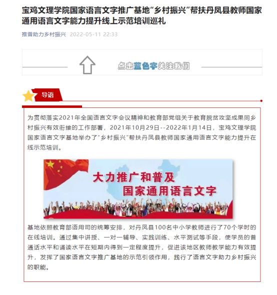 5月11日,教育部“推普助力乡村振兴”平台报道了我校国家语言文字推广基地举办的“乡村振兴”帮扶丹凤县教师国家通用语言文字能力提升在线示范培训活动。