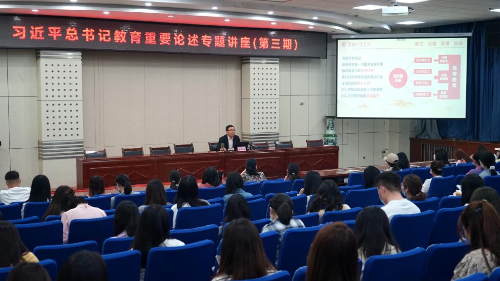 5月17日晚,校长郭霄鹏以《推动党和国家各项事业发展的重要先手棋--坚持优先发展教育事业》为题,通过线下线上结合的方式,在高新校区木铎厅主会场和各学院分会场为全校257名2021级教育类研究生讲授了一堂生动而深刻的主题思政课。