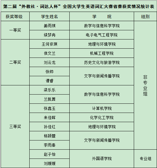 近日,我校学生在第二届“外教社·词达人杯”全国大学生英语词汇大赛省赛中取得优异成绩。本科非英语专业组的姜雨祺、续梦冉2位同学获省赛一等奖,王何依琪等5名同学获省赛二等奖;本科英语专业组的赵子怡、刘媛媛2位同学获省赛三等奖。