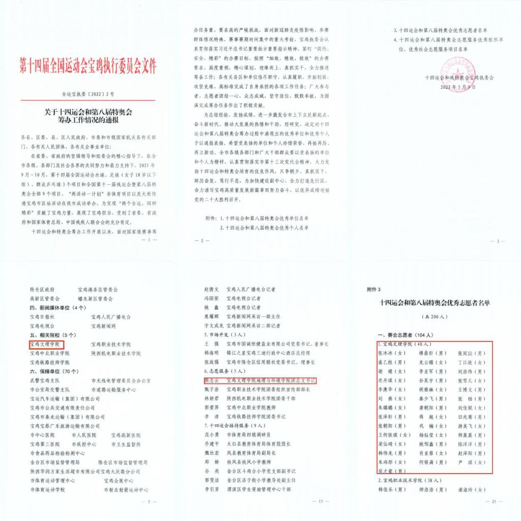 近日,十四运会和残特奥会宝鸡执委会下发了《关于十四运会和第八届特奥会筹办工作情况的通报》,对十四运会和第八届特奥会志愿服务优秀单位、个人以及优秀志愿者进行通报表扬。我校荣获“十四运会和第八届特奥会优秀单位”荣誉称号,地理与环境学院团总支书记熊志云荣获“十四运会和第八届特奥运会优秀个人”荣誉称号,张冰冰、穆鼎轩等40名同学被评为“十四运会和第八届特奥运会优秀志愿者”。