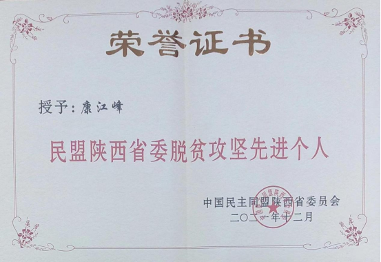 近日,民盟宝鸡文理学院总支康江峰被授予“民盟陕西省委脱贫攻坚先进个人”称号,以表彰他在全省脱贫攻坚进程中所作的贡献。同时,康江峰、王建宁两位盟员还分别荣获民盟陕西省委2021年度盟务工作“先进个人”称号。