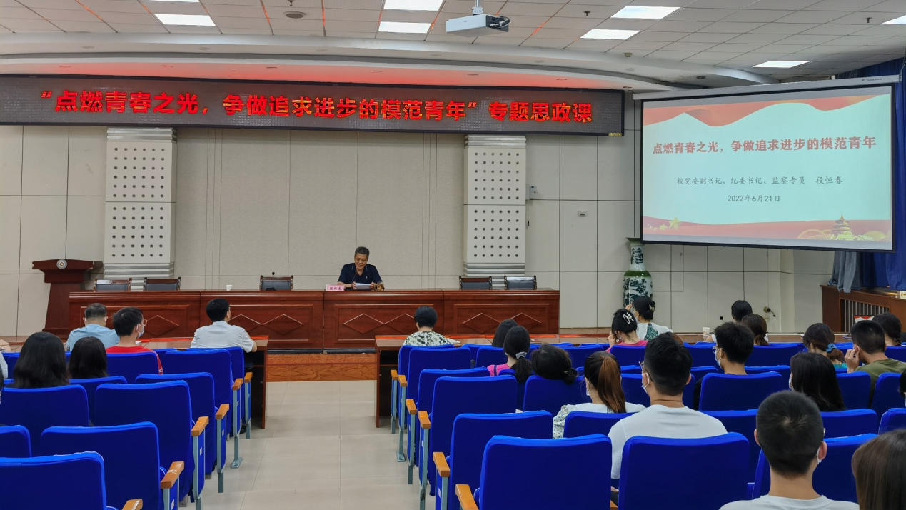 6月21日下午,校党委副书记、纪委书记、监察专员段恒春以《点燃青春之光,争做追求进步的模范青年》为题,在高新校区木铎厅为政法学院青年大学生讲授专题思政课。