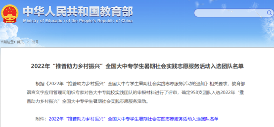 根据《2022年“推普助力乡村振兴”全国大中专学生暑期社会实践志愿服务活动的通知》相关要求,教育部语言文字应用管理司组织专家对各大中专院校实践团队的申报材料进行了评审,我校赴太白语言助力乡村振兴实践团队入选2022年“推普助力乡村振兴”全国大中专学生暑期社会实践志愿服务活动。